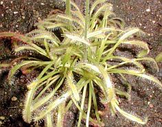 | | ist mit einer Wuchshöhe von 15 bis 34 Zentimetern und einer Sprossachse von 4 bis 7 Zentimetern ein recht großer Sonnentau und wächst in Peru. Die in einer Rosette stehenden Blätter sind weinrot, länglich-rund im Alter am Stämmchen herabhängend. Die Blattunterseite ist unbehaart. | Gruppe | subtropisch | | Temp.Sommer/Winter | 20°-35° / 5°-15° | | Luftfeuchte | 40 - 80% | | Wasser | permanenter Anstau (1-2 cm) | | Standort | vollsonnig, färbt sich rot | | Substrat | Torf / Sand 7:3, reiner Torf, Spaghnum | |  | Die ein oder zwei Blütenstände sind bis zu 31 Zentimeter lang, weinrot und mit Drüsenhaaren besetzt. Drosera graomogolensis wächst in der brasilianischen Region Grao-Mogol auf feuchten und trockenen Sandböden, zwischen Felsen oder an Flussufern unter eher kühlen Bedingungen, verträgt aber auch höhere Temperaturen. Bei sehr hellem Standort färbt er sich intensiv Rot. Im Moment befindeter sich in 6:4 Torf/Sand Substrat draußen in voller Sonne auf dem Balkon. Tip: Drosera graomogolensis kann leicht durch Blattstecklinge vermehrt werden. | Drosera intermedia Der Mittlere Sonnentau (Drosera intermedia) kommt auf der nördlichen Hemisphäre in Europa und im östlichen Nord- wie Südamerika vor und ist mit Drosera rotundifolia und Drosera anglica der einzige in Europa heimische Vertreter der Gattung. Die Art ist in Deutschland geschützt. In der Natur findet man ihn häufig auf ganz kahlem, sehr nassem Boden, in Moorwäldern sowie auf wechselnassen Anmoor-Sandböden, wo er manchmal sogar überflutet wird. | Gruppe | gemäßigt / tropisch | | Temp.Sommer/Winter | 20°-35° / 5°-15° | | Luftfeuchte | 40 - 80% | | Wasser | permanenter Anstau (1-2 cm) | | Standort | vollsonnig, färbt sich rot | | Substrat | Torf / Sand 7:3, reiner Torf, Spaghnum | Bevorzugte Standorte sind vollsonnige, staunasse Böden. Einheimische Klone bilden eine Winterknospe, sind winterhart und vertragen auch längere Frostperioden. Ich kultiviere allerdings auch die tropische Form "Big Audrey", die keine Hibernakel bildet und nicht frosthart ist. Vermehrung durch samen, die leicht angesetzt werden. bedingungen zur aussaht gleich wie für d. rotundifolia. .In Kultur gedeiht Drosera intermedia am besten auf reinem Weisstorf. | Drosera indica | Gruppe | subtropisch | | Temp.Sommer/Winter | 20°-35° / 5°-15° | | Luftfeuchte | 40 - 80% | | Wasser | permanenter Anstau (1-2 cm) | | Standort | vollsonnig, färbt sich rot | | Substrat | Torf / Sand 7:3, reiner Torf, Spaghnum | | | | Drosera madagascariensis - {D.C.} 1824 (B) Wie man ihrem Namen entnehmen kann, kommt die Pflanze unter anderem in Madagaskar vor. Außer in Madagaskar kann man sie noch in Guinea, Nigeria, Kamerun, dem Tongo und Zambia finden. Meine Drosera madagascariensis stammt aus dem OBI und war die einzige neben dutzenden von Capensis und Aliciae. Sie war nur mit "Drosera" ausgezeichnet und es dauerte einige Zeit, bis ich herausbekam, was sie ist (noch heute nicht zu 100% sicher, da sie sowohl im offenen als auch im Tropenterrarium wuchert..) Drosera madagascariensis wächst aufrecht und kann im Alter einen relativ hohen Stamm bekommen. Die Pflanzen neigen dann dazu umzukippen, wenn sie nicht gestützt werden. Die Pflanze ist ohne Probleme angewachsen. | Gruppe | tropisch | | Temp.Sommer/Winter | 20°-35° / 5°-15° | | Luftfeuchte | 40 - 80% | | Wasser | permanenter Anstau (1-2 cm) | | Standort | vollsonnig, färbt sich rot | | Substrat | Torf / Sand 7:3, reiner Torf, Spaghnum | | Meine Pflanzen stehen ganzjährig im Terrarium. Die Wintertemperatur halte ich bei minimal 15°C. Die Pflanzen sterben bei mir im Winter gelegentlich ab, treiben aber aus den Wurzeln im Frühjahr wieder neu aus. Werden sie warm überwintert, wachsen sie einfach durch. Als Substrat verwende ich eine Torf/Perlite-Mischung, im Tropenterrarium Torf/Sand 7:3. Gegossen wird im Anstau. Vermehren lässt sich Drosera madagascariensis am einfachsten über Blatt- und Wurzelschnittlinge. Blattstecklinge setzen sogar zum Teil mehr als eine Pflanze pro Blatt an. Die Vermehrung über Samen ist nicht viel schwieriger. Das größte Problem hierbei scheint zu sein, die Pflanzen zum Blühen zu bewegen. Blühen die Pflanzen aber erstmal, kann man auf viele Samen hoffen. Die Samen streue ich einfach auf das Substrat aus und halte den Topf feucht. Nach ca. 4 Wochen keimen die Samen dann. Die Pflanzen sind im folgenden Jahr auch wieder blühfähig.
