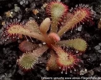 | Kultur: ziemlich einfach, wenn man für ausreichend Licht sorgt. Sie wachsen im Terrarium bei Temperaturen um die 30°C, sie wachsen am hellen Fenster oder im Sommer auf dem Balkon. Die Art verträgt kühle Temperaturen genauso und es ist kein Problem, die Pflanzen bis in den Herbst draußen zu kultivieren. Eine Winterruhe benötigt die Art nicht zwingend. Es ist also möglich, sie im Terrarium durchzukultivieren. Im Freien sterben sie im Winter schon mal oberirisch ab, treiben im Frühjahr aber wieder aus den Wurzeln aus. Drosera venusta bestäubt sich selbst. Man erhält viele kleine Samen, die eine sehr hohe Keimrate haben. Keimlinge wachsen auch innerhalb von einigen Monaten recht schnell zu blühfähigen Pflanzen, wenn man ihnen gute Bedingungen bietet. Als weiterer Weg der Vermehrung funktionieren auch Blattstecklinge und Wurzelschnittlinge sehr gut. Die Art verfügt über verhältnismäßig lange Pfahlwurzeln. Als Substrat ist ein Torf-Quarzkiesgemisch gut geeignet. Drosera venusta muss meines Erachtens nicht so nass stehen. Ein feuchtes, lockeres Substrat ist ideal. Im Sommer ist ständiger Anstau aber ratsam. Drosera venusta ist eine ideale Einsteiger-Art. Sie ist sicher nicht schwieriger in der Kultur, als eine Drosera aliciae. Für die Vermehrung durch Blattstecklinge schneidet man einfach ein paar Blätter ab und legt diese in destilliertes Wasser oder auf feuchtes Anzuchtsubstrat. Nach ein paar Wochen bilden sich auf der Blattoberseite kleine Pflanzen. Diese kann man dann topfen und normal weiter kultivieren. Meine D.venusta stammt von Tropico und steht im offenen Terrarium.