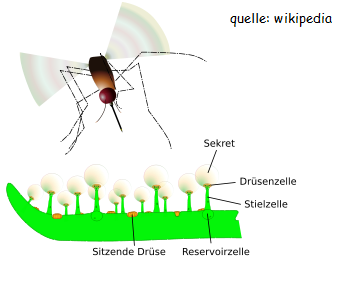 Beschreibung: Fettkräuter (in Liechtenstein und Teilen der deutschsprachigen Schweiz auch Fettblätter genannt) gehören mit Utricularia und Genlisea zur Familie der Wasserschlauchgewächse (Lentibulariaceae). Alle Gattungen dieser Familie sind fleischfressende Pflanzen. Von derzeit ca. 100 Pinguicula-Arten sind auch vier im deutschsprachigen Raum heimisch. Die Mehrzahl findet sich jedoch in Mittelamerika. Fast alle Fettkräuter sind mehrjährige krautige Pflanzen; alle Arten bilden bodenständige Rosetten. Die Blätter sind glatt, fest und sukkulent, von meist hellgrüner, bei viel Licht gelb bis gelegentlich rötlich überhauchter Farbe. Je nach Art können die Blätter bis zu dreißig Zentimeter groß und unterschiedlich, meist jedoch eiförmig, spatelförmig oder länglich geformt sein. Falle: Die Blattoberfläche der karnivoren Blätter sind mit Drüsen versehen, die einerseits das den Pflanzen den Namen gebende klebrige Fangsekret absondern (gestielte Drüsen) und andererseits die enzymhaltige Verdauungsflüssigkeit ausscheiden, die die Beute zersetzt (sitzende Drüsen). Ich verlinke auf eine gute Darstellung bei Wikipedia: Bild |